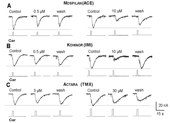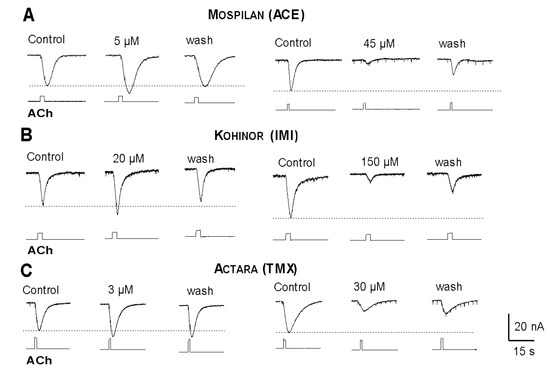 Inhibitory effects of neonicotinoids on ACh-evoked inward currents by Mospilan (A), Kohinor (B) and Actara (C). Concentration values are expressed in molarities of the active components of the individual insecticides.