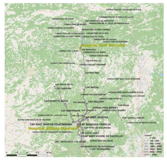 Productive time (commuting to the hospital) lost by patients and caregivers was considered. The user also benefits from greater agility in the resolution of the case, reducing waiting time, as well as in terms of travel time to a hospital consultation (Hospitals in Manresa and Berga). Employing the methodology used by Vidal-Alaball et al. 2019 [13], through a combination of the R 3.6.1 software (The R Foundation for Statistical Computing, Vienna, Austria), a Google Maps API and the information from each of the user’s Primary Care Team (as a proxy for the user’s place of residence), together with the referral hospital, a very accurate calculation of the total number of kilometers and time of journeys saved by the intervention was obtained (Figure 2). Therefore, the sample saved 893,820 kilometers (21.58 km per case, for the round trip) and 16,812 hours (25 minutes per case) of travel. The costs to users (patient and caregiver) have been calculated by multiplying travel and consultation time by the average salary/hour.