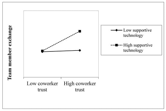 Kramer [67] argued that a technology may promote trust only to the extent that it optimizes compliance with organizational rules. Similarly, Branscomb and Thomas [68] have advocated for software engineers to develop user-friendly software products aiming to ensure acceptance, supportability, and easy use; factors that are characteristic of supportive technology. King [69] emphasized that modern technologies that address user needs are vital to the success of these systems. Therefore, this study tested the possibility that the interaction between trust and employee perception that the work team’s technology is supportive may positively impact TMX and posited the following hypothesis.
