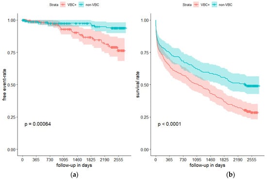 Survival analysis using Kaplan–Meier method of the presence of recurrent stroke ((a) Panel A) and death ((b) Panel B) during 7 years in the population of 448 patients with ischemic strokes according to presence of arterial calcifications in intracranial vertebral arteries and/or basilar artery. Vertical lines represent censored data. VBC+: vertebrobasilar calcifications present. Crosses represent censored (died and lost to follow-up) data.