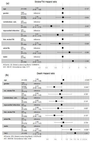Forrest plots depicting hazard ratios for recurrent stroke/transitory ischemic attack ((a) Panel A) and death ((b) Panel B) in population of 448 ischemic stroke patients followed up to 7 years. Legends: vertebrobas. calc.–presence of vertebrobasilar calcifications; TIA–transitory ischemic attack; hist. stroke/TIA–history of stroke and/or TIA; rec. stroke/TIA–recurrent stroke/TIA; atrial fib.–history of atrial fibrillation; TACI–total anterior circulation stroke; and statin–taking statin upon inclusion in the study