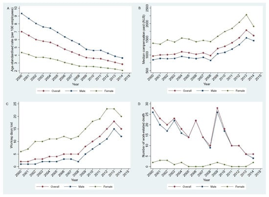 Trends in workers’ compensation claim statistics in South Australia, 2000–2014: (A) age-standardised claim rates, (B) median compensation payments, (C) interquartile range of working days lost, and (D) the number of work-related deaths.