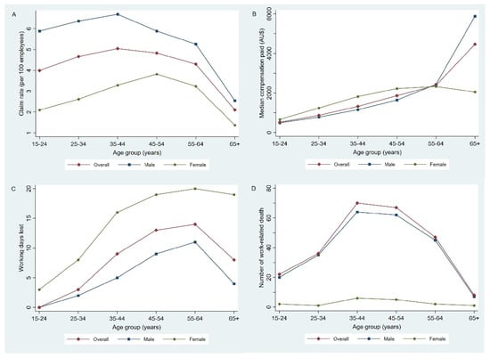 Our results also showed that claim rates of male workers decreased as age increased in most industries. Higher non-fatal injury rates among young male workers have also been observed in other countries (e.g., USA) [37,38], although young workers can be less likely to make injury claims than older workers according to the ABS WRIS survey [36]. Young male workers’ vulnerability to injury in the workplace has generally been attributed to lack of occupational risk awareness, training, and relevant work skills, together with peer pressure [38]. Young workers’ health and safety have been listed as one of the occupational research priorities by Safe Work Australia [20].