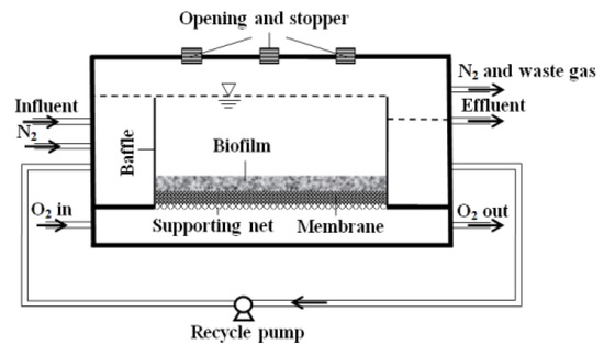 At the initial stage of biofilm culture, activated sludge collected from the anaerobic digester at the Gold Bar Wastewater Treatment Plant in Edmonton was inoculated into the reactor. After successfully starting up, pure O2 with a flowrate of 20 mL/min was flowed through the silicone membrane. N2 was purged into the influent to make the synthetic wastewater O2-free.