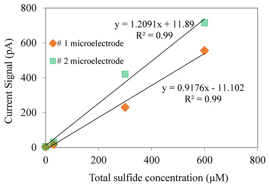 The response of H2S microsensors could be related to pH values. In this study, we calibrated H2S microelectrodes under neutral pH conditions, as our wastewater biofilm was operated under neutral pH conditions. Standard solutions of H2S (0–400 M) were prepared by transferring certain amounts of the Na2S stock into the de-aerated pH 7.0 phosphate buffer. The calibration curve is shown in Figure 2. It can be seen that the H2S are linearly related to the current signal with a R2 higher than 0.99.