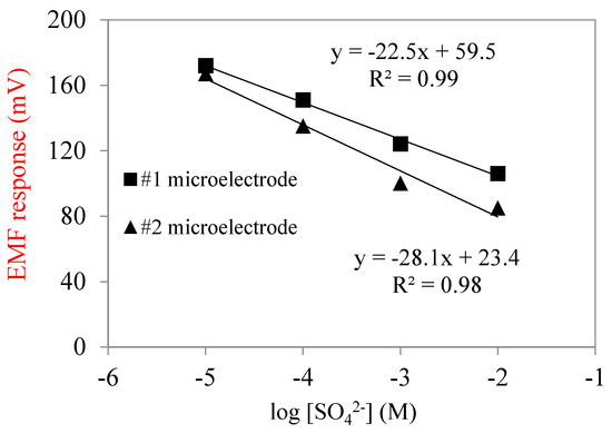 The fabricated SO42− microelectrodes needed to be calibrated and validated before measurement. The linear relationship between electromotive force (EMF) and sulfate concentration was used to indicate microelectrode performance. The calibration curve is shown in Figure 3. In this study, the Nernstian slopes of calibration curves were close to −28.1 mV/decade, and the R2 values were greater than 98%. Within the selected concentration range from 10−5 M (0.96 mg/L) to 10−2 M (960 mg/L), the response of sulfate microelectrodes was log-linearly related to their concentration. Sulfate concentrations in domestic wastewater are usually from 20 to 500 mg/L; therefore, the sulfate microelectrodes fabricated in this study covered the concentration detection range.