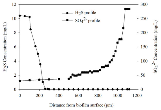 As shown in Figure 5, the H2S concentration profile showed that H2S production was limited to the zone near biofilm surface (0–285 µm, setting 0 as the interface between bulk water and biofilm) of the biofilm, while sulfate gradually decreased from 283 mg/L at the bottom of the biofilm near the membrane surface until it reached about 35 mg/L near the surface biofilm (anoxic zone). The sulfate reduction activity could not only be indicated by the average sulfate removal in bulk water phase, but also by the production of H2S along with a decrease of sulfate within the biofilm microenvironment. This expands on previous research that showed sulfate reduction activity to rely solely on sulfide microelectrodes [20].