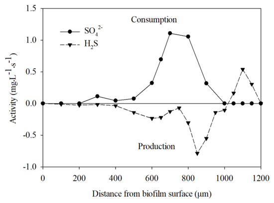 Based on the consumption of H2S accompanying the production of SO42− at the surface anoxic zone of the biofilm (400–1000 μm), it is speculated that sulfate-reducing species were present in this region to conduct the sulfate reduction activity. Findings here correspond with previous studies showing that sulfate-reducing species can be present in the anoxic zone within biofilms [9,24]. A detailed molecular analysis of gene information and spatial distribution of sulfate -reducing bacteria will be needed in further research.