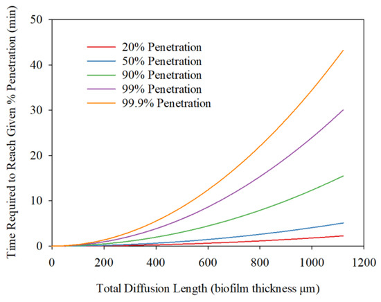 In order to further investigate the diffusion and reaction of H2S within the biofilm, the required diffusion time was estimated based on t = FL2/D, where F was obtained from Per Heisler Charts, D is the diffusion coefficient, and L is biofilm thickness. When considering the transport and reaction of chemicals in biofilm, it is necessary to estimate the time required for diffusion through the biofilm by assuming that reactions were not considered, which helps clarify observations when considering diffusions and reactions simultaneously. In the case of diffusion only, the time required to reach 20%, 50%, 90%, 99%, and 99.9% of the H2S concentration out of biofilm are shown in Figure 7. For example, 30 min are needed for 99% of the produced H2S reach to the biofilm surface, and 5 min will be needed for 50% of the produced H2S to be diffused from the biofilm at a 1120-μm thickness.