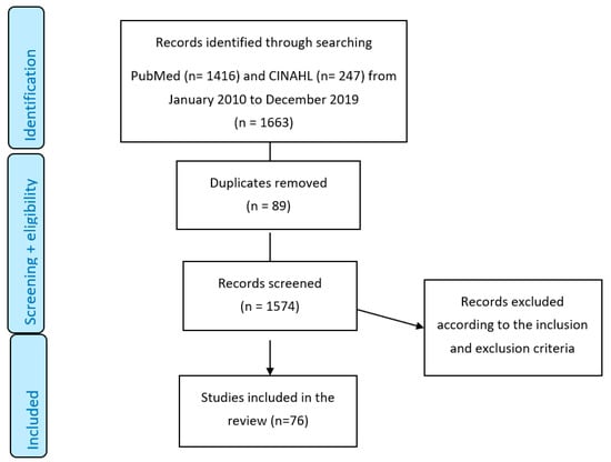 The contents of this overview of review are based on 76 included systematic review papers. See Figure 1 for the Preferred Reporting Items for Systematic Reviews and Meta-Analyses (PRISMA) flow chart. Some reviews covered more than one area of interest.
