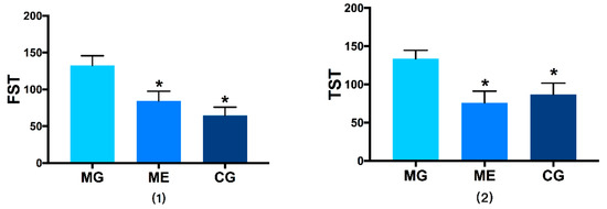 (1) shows the results of the forced swim test, Picture (2) shows the results of the tail suspension test. Control Group = CG, Model Group = MG, and Model Exercise Group = ME. * indicates significant difference compared with MG (p < 0.01).