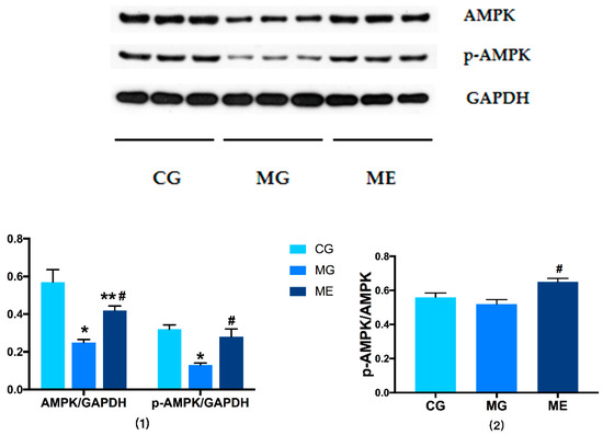 In terms of AMPK phosphorylation level, there was significant difference between MG and CG. The p-AMPK in MG was significantly downregulated (p < 0.01), ME was significantly upregulated compared with MG (p < 0.01), and there was no significant difference between ME and CG. The ratio of pAMPK/AMPK in ME was significantly upregulated than MG (p < 0.01). There were no significant difference between MG and CG. The results are reported in Figure 2.