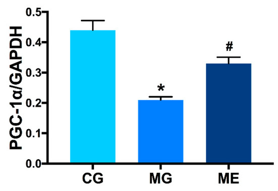 Protein: PGC-1α, Internal reference protein: GAPDH. Control Group = CG, Model Group = MG, and Model Exercise Group = ME; * indicates p < 0.01 compared with CG; # indicates p < 0.01 compared to MG.