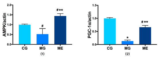 In terms of the level of gene transcription, in AMPKαmRNA expression, MG was downregulated compared to CG (p < 0.05), and ME was upregulated compared to MG. Both were significantly different (p < 0.01). Compared with CG, MG saw highly significant trend of downregulation in PGC-1αmRNA expression (p < 0.01). In ME, the expression level of PGC-1αmRNA was downregulated compared with MG (p < 0.01), lower than CG (p < 0.05). The results are reported in Figure 4.