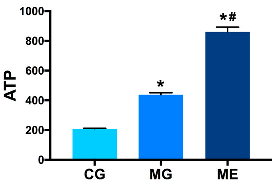 In terms of ATP level, ME > MG > CG. Compared with CG, the ATP level of MG was significantly higher (p < 0.01), and the ATP level in ME was more than twice as high as that in MG (p < 0.01). The results are reported in Figure 5.