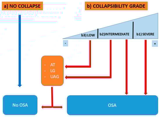 (b2) Patients with an intermediate grade of UA collapsibility develop OSA in relation to the pathologic grade of severity of the other non-anatomical PT (AT, LG, and UAG) or in relation with the grade of UA collapsibility severity.