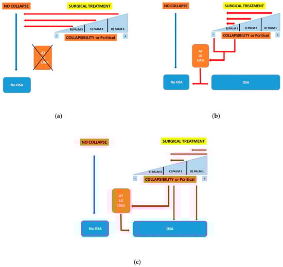 There are sparse data on the relationship between UA surgical treatment and Pcrit or muscular UAG [90]. When the relationship between anatomical collapsibility and UA surgery is taken into account, it is possible to identify three likely outcomes (Figure 2a–c):