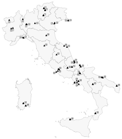 In the period 2011 to 2019, a total of 1374 raw sewage samples were collected from 48 WTPs distributed over the entire country and covering all the 20 Italian administrative regions: 529 samples were taken from 8 Regions of Northern Italy (Emilia Romagna, Friuli Venezia Giulia, Liguria, Lombardy, Piedmont, Trentino-South Tyrol, Veneto, and Aosta Valley), 590 from 5 Regions of Central Italy (Abruzzo, Latium, Marche, Tuscany, and Umbria) and 255 from 7 Regions of Southern Italy (Apulia, Basilicata, Calabria, Campania, Molise, Sardinia, and Sicily). Figure 1 shows a geographic information system (GIS) map of the WTPs included in the study.