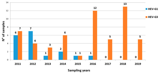 Of the 74 positive samples, 56 were characterized as G3 and 18 as G1. While G3 sequences were detected in all the 9 years of monitoring (Figure 3), G1 sequences were mainly detected in 2011–2012 (13 of 18; 72%). Thereafter, only five G1 samples were found between 2013 and 2016, while in the triennium 2017–2019 only G3 sequences were detected.