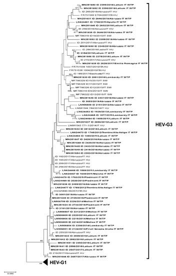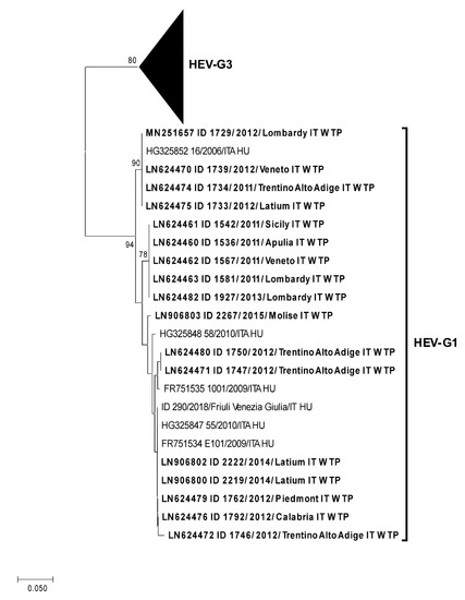 - La Rosa, G.; Muscillo, M.; Vennarucci, V.S.; Garbuglia, A.R.; La, S.P.; Capobianchi, M.R. Hepatitis E Virus In Italy: Molecular Analysis Of Travel-Related And Autochthonous Cases. J. Gen. Virol. 2011, 92, 1617–1626. [Google Scholar] [CrossRef] [PubMed]