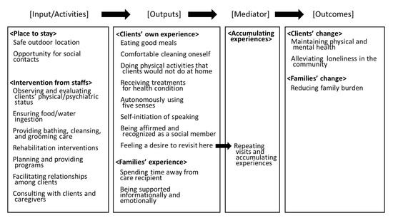 We described a logic model for ADC that has two service aspects, namely “a place to stay” and “ntervention from staffs”, and which provides various experiences for clients and their caregivers, ranging from the fulfillment of needs for fundamental care to psychiatric/self-actualization. The described model makes two contributions to the understanding of the cause and effect within ADC services. First, the model clarifies the elements of the model components. Second, the accumulation of experiences was determined to be an antecedent of the outcome improvement.