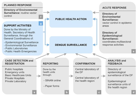 Suspected cases of dengue are identified and notified from the healthcare units (Figure 1a) through the online portal or paper forms (Figure 1b). Laboratory confirmation is conducted by the Central Laboratory of Public Health (Figure 1c), and the data are analyzed by the Directory of Epidemiological Surveillance (Figure 1d). The Directory of Epidemiological Surveillance is also responsible for response activities (Figure 1e), along with the Directory of Environmental Surveillance, which conducts vector control (Figure 1e,f). The model also shows support activities, which are conducted by the Ministry of Health (Figure 1g).