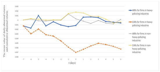 Table 3 presents the average daily abnormal returns (ARRs) and cumulative abnormal returns (CARs) around the passage of the Environmental Protection Tax Law in terms of polluting character for different event windows in Panels A and B respectively. In addition, we draw t 1 based on Panel A to visually show the differences in ARRs and CARs for firms in heavy-polluting industries and non-heavy-polluting industries.