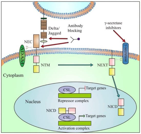 Diagram of Notch receptor activation and therapeutic target in clinical development. Notch signaling is initiated by ligand binding to Notch receptor, which undergoes a two-step proteolytic cleavage by ADAM family proteases and γ-secretase, releasing the Notch intracellular domain (NICD). The NICD translocates to the nucleus where it binds to CSL and converts the complex from a repressor to an activator of Notch target genes. Notch signaling could be inhibited by two major classes of Notch inhibitors: γ-secretase inhibitors and monoclonal antibodies directing against Notch receptors or ligands. Abbreviations: NEC, Notch extracellular subunit; NTM, Notch transmembrane fragment; NEXT, Notch extracellular truncated; CSL, C protein binding factor 1/Suppressor of Hairless/Lag-1; NICD, Notch Intracellular Domain. Reproduced with permission from Yuan X, Wu H, Xu H, Xiong H, Chu Q, Yu S. Notch signaling: An emerging therapeutic target for cancer treatment. Cancer Letters. 2015, 369, 20–27 [34].