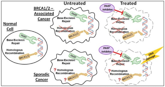 Poly (ADP-ribose) polymerase (PARP) inhibitor treatment of BRCA-1/2-associated and sporadic cancers. Reproduced with permission from Leif W. Ellisen. PARP Inhibitors in Cancer Therapy: Promise, Progress, and Puzzles. Cancer Cell. 2011, 19(2), 165–167 [66].