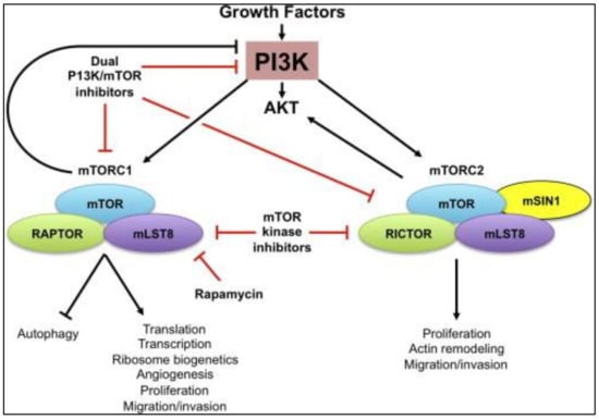 Mammalian target of rapamycin (mTOR) signaling pathway. mTOR is a subunit of two distinct multi-protein complexes, mTORC1 and mTORC2. Both mTORC1 and mTORC2 can be activated in response to growth-factors stimulation, whereas mTORC2 is a major kinase that phosphorylates and activates Akt. The importance of mTORC1 and mTORC2 in regulation of multiple cell functions vital for development of cancer and their strong interaction with oncogenic pathways make mTOR an attractive target for therapeutic intervention. The mechanisms of action of currently available mTOR inhibitors are shown. Reproduced with permission from Zaytseva YY, Valentino JD, Gulhati P, Evers BM. mTOR inhibitors in cancer therapy. Cancer Letters. 2012, 319, 1–7 [68].