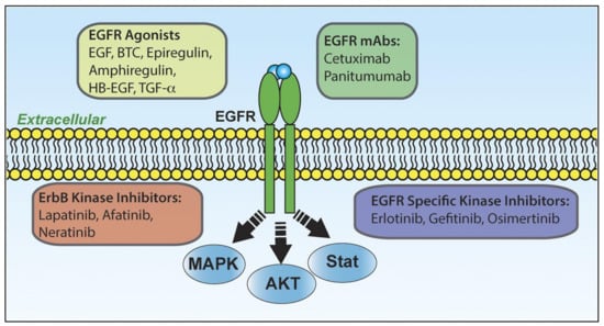 A schematic representation of the activators, inhibitors and outcomes of epidermal growth factor receptor (EGFR) signaling. EGFR is part of the four-member ErbB superfamily (ErbB1–4). These receptors form several different homo- and heterodimers (here we only depict the EGFR homodimer). EGFR is capable of binding several different extracellular ligands that agonize the receptor leading to activation of several downstream signaling events including, but no limited to those listed. Several therapeutics have been developed to antagonize EGFR including monoclonal antibodies (mAbs) that block ligand binding as well as several different kinase inhibitors. In addition to EGFR, some of these kinase inhibitors also target other ErbB receptors, supporting their use in human epidermal growth factor receptor-2 (Her2)-amplified breast cancer (BC). All of the listed therapies are Food and Drug Administration (FDA) approved for various cancers with the exception of Neratinib. Reproduced with permission from Ali R and Wendt MK. The paradoxical functions of EGFR during breast cancer progression. Signal Transduction and Targeted Therapy 2017, 2(16042), 1–7 [81].