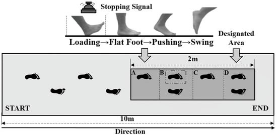 Subjects were then instructed to perform two types of gait termination tests on the runway. The two-meter-long plantar pressure plate was artificially divided into four sections (A, B, C, and D), and every section was about 50 cm × 50 cm. Their primary task was to use the non-dominant leg (left leg) and dominant leg (right leg) to pass section A and B, respectively, and finally terminate on the designated area (section D). If participants received the stopping signal, if the heel of the left foot touched section A, as a result, unplanned gait termination needed to be executed to enable subjects to stop quickly on section B (Figure 1). The staff would send the termination instruction to the subjects by randomly ringing a bell, and the probability of ringing was controlled at about 25%.