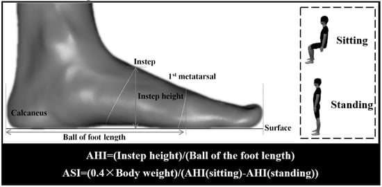 Based on the two-dimensional foot image obtained from foot morphological scanning, the variables of foot structure were calculated with the AutoCAD software (Autodesk, San Rafael, CA, USA). AHI was measured as the vertical distance from the instep point to surface (instep height) divided by the distance from the first metatarsal joint protrusion to the most posterior point of the calcaneus (ball of the foot length) [,]. Each participant’s ASI was calculated by comparing AHI difference between sitting and standing conditions. Zifchock et al. [,] indicated that 40% bodyweight (BW) was normalized owing to weight difference supported by the feet in the seated (10% BW) and standing positions (50% BW). Figure 2 outlines detailed foot morphology variables and formulas for calculating AHI and ASI.