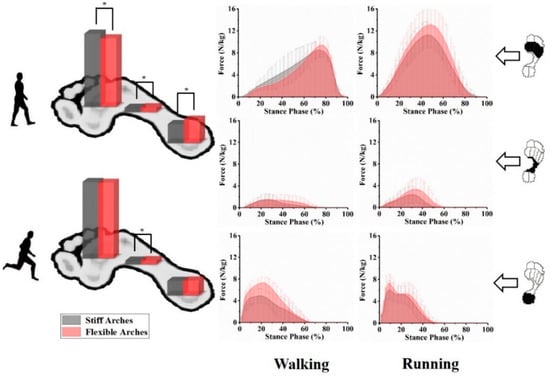 It was previously believed that flexible arches were better for splaying in stance phases, shifting the midfoot loading forward and backward concurrently on the longitudinal axis []. However, our results are consistent with the findings of Zifchock et al. [] and contradicted the abovementioned conclusion. In both walking and running tests, stiff arches showed a larger and smaller proportion of total plantar impulse in the forefoot and rearfoot parts, respectively, than flexible arches. The unidirectional impulse transfer on the plantar longitudinal axis could be related to the irregular, asymmetrical triangular truss model formed by the bones of the arch and plantar fascia []. The relatively short proximal triangular side firmly attaching the calcaneal tuberosities may bear more impulse during compression of the arch.