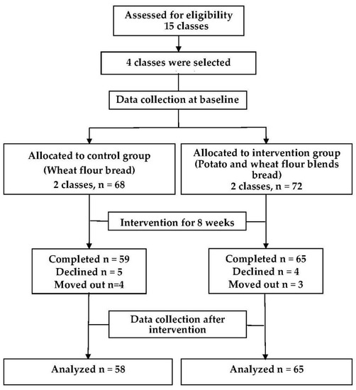 This study was designed to be a randomized controlled trial. Four classes were randomly selected in the lottery in first grade from one senior middle school, and all students in the selected classes were enrolled in the trial. The four classes were randomly allocated to the intervention group (two classes) and control group (two classes) according to the random cluster method. Students from the same class participated in the same group. The intervention group was provided with steamed potato bread produced from a blend of raw wheat and cooked potato flour, and their counterparts in the control group were provided with steamed bread produced from raw wheat flour only. Dehydrated cooked potato flour was blended with wheat flour at 30% by weight to make steamed potato bread. The intervention lasted for 8 weeks. During the intervention, the steamed bread was consumed once every school day. Other foods provided to both groups were the same. Figure 1 illustrates the flow of participants through the trial. This trial was registered with the Chinese Clinical Trial Registry (ChiCTR1900027027).