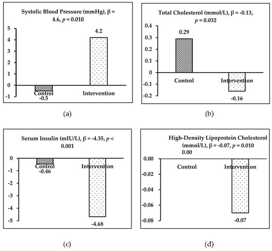 The significant intervention effects (β) in two groups: (a) SBP, (b) CHO, (c) INS and (d) HDL-c.