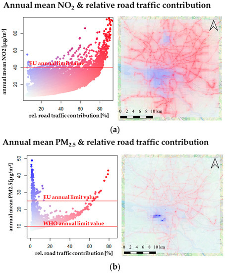 Modeled concentrations of annually averaged NO2 (a) and PM2.5 (b) plotted against relative contributions of road traffic. The range and color scale in the maps follows the colors of the scatter plot, which is the legend for the value maps’ value ranges. Darker red colored areas indicate higher concentrations with higher traffic contributions. Darker blue areas indicate higher concentrations and no traffic contributions. Concentrations increase with color intensity.
