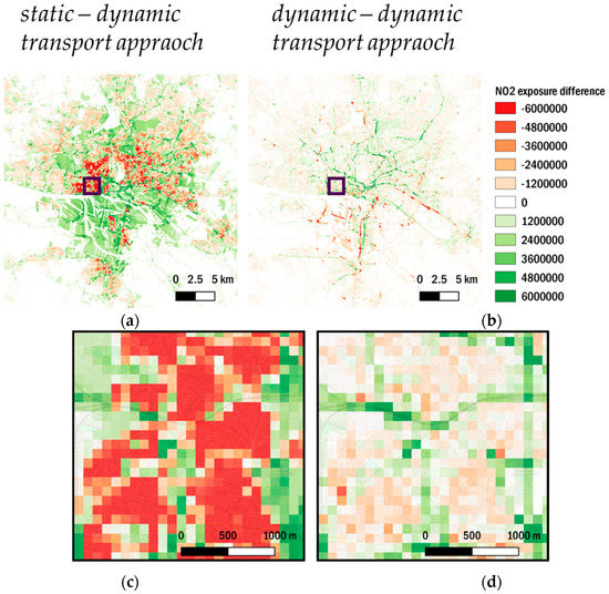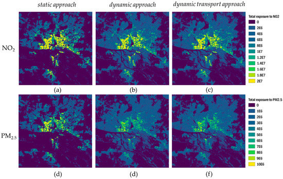 In this study, we set numerical results on the population exposure, population-weighted exposure values as annual averages, as well as maps with a spatial resolution of 100 × 100 m2 of total exposure for the different approaches (static, dynamic, dynamic transport), and difference maps are presented.