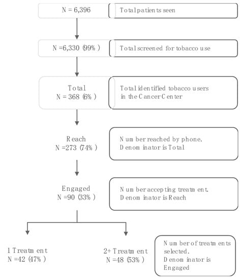 - Karam-Hage, M.; Oughli, H.A.; Rabius, V.; Beneventi, D.; Wippold, R.C.; Blalock, J.A.; Cinciripini, P.M. Tobacco cessation treatment pathways for patients with cancer: 10 years in the making. J. Natl. Compr. Cancer Netw. 2016, 14, 1469–1477. [Google Scholar] [CrossRef][Green Version]