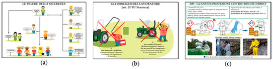 When safety training is administered to workers from different countries, the difficulty in the comprehension of the safety material used by trainers during lectures should be carefully considered. Indeed, the diversity of the languages, cultures and education of migrant workers often prevent them from understanding OSH rules and correct practices [9], which may lead to the adoption of incorrect and unsafe behaviours, increasing the risk of incidents and injuries [10]. During intercultural OSH lectures, the trainer is often supported by visual tools such as maps, PowerPoint presentations or other slides, keywords or diagrams on flip charts and videos to overcome language barriers [11] and to increase trainees’ comprehension of the safety information explained [10]. Previous studies have reported inconsistent results on the effects of training interventions among migrant farmworkers. Indeed, some studies have reported significant positive effects of training in terms of increased farmworkers’ knowledge of OSH issues [12,13], whereas other studies have found no differences between trained and untrained participants [14,15,16,17]. Some authors have interpreted these contrasting results in light of the need to adapt the training materials to an audience of migrants [10,18,19,20], considering particularly the content, layout and style of the graphics [21], to make safety communication more effective. A relevant contribution to reach this aim may come from ergonomics and its user-centred perspective in system design [22]. The ergonomics discipline focuses on users and their capabilities and needs to plan, design and evaluate human–artefact interactions, aiming to promote safety, healthiness and performance in living and working environments. The ergonomic approach is based on users’ active involvement in both the development and evaluation of design solutions that should meet users’ requirements, resulting in usable products, interfaces and services [23,24].