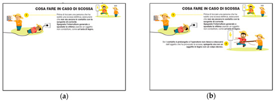 Based on the exploration of the critical issues in traditional training material and suggestions for improvement, the training material was developed by taking into consideration specific design criteria and user requirements [47]. The developed graphical training material, which underwent the evaluation, was composed of 75 slides realised in 2D graphics. The visuals depicted those training topics identified as more critical during the focus groups with migrants and trainers in the analysis of training needs. The type of graphical representation used in the new slides was chosen based on the suggestions that emerged during focus groups. Thus, the human figures in the graphical materials presented funny facial expressions and a cartoon style. The features of the characters were defined according to the role that each character plays in the workplace and to facilitate workers’ identification with the depicted human figure. To meet the demand of more images, photographs were used together with pictures and icons to enhance the noticeability of hazards and to facilitate the contextualisation of some hazardous situations. The images represented the main part of the slides, while the text was reduced with the purpose of accompanying the pictures with short sentences and highlighted keywords (e.g., sources of risk in the workplace). The physical/spatial relationship between the text and pictures was designed by taking into account the principle of text parallels [48] to make the text and pictures mutually supportive. Some examples of the developed material are provided in Figure 1.