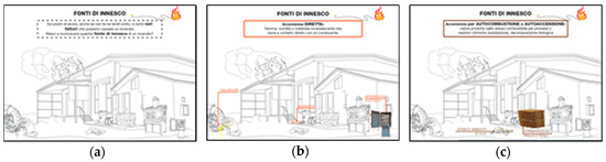 Figure 3. Quiz slide to encourage the involvement of participants in regard to fire risk: (a) participants were asked whether they recognised some ignition sources; (b) direct ignition source was highlighted; and (c) spontaneous ignition source was highlighted.
