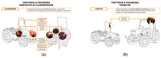 Figure 4. Images developed to focus users’ attention on specific details on the tractor: (a) what and where the lighting devices are and (b) where the vision devices such as the rear-view mirrors are.