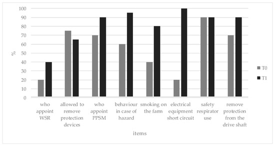 Overall, the response analysis reported an increase in knowledge from T0 to T1. More specifically, the post-test knowledge showed a higher mean percentage of correct answers (81.3%) compared with the mean rate of correct answers reported during the pre-test (55.6%). Concerning the pre-test questionnaire, the items that reported the lowest rate of correct answers were the question related to the appointment of the WSR and that related to the short circuit of electrical equipment (each question reported only 20% correct answers). In contrast, the question related to PPE adoption (safety respirator) yielded a higher percentage of correct answers (90%). Concerning the post-test questionnaire, the lowest score was reported for the appointment of the WSR, even though an increasing rate of correct answers was reported after the training (40%). The question related to electrical risk had the highest comprehension rate (100%). Detailed information regarding the correct answers is reported in Figure 5.