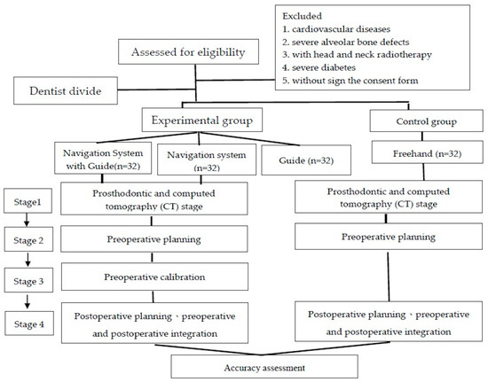 In this study, the recruitment criteria were age of 20 years or older and requirement of dental implant surgery according to an assessment made by a dentist. The exclusion criteria were that patients with cardiovascular diseases, those with severe alveolar bone defects, those who had received head or neck radiotherapy, those with severe diabetes, and those who could not sign the consent form because they did not understand its content. All participants agreed to participate in the study and signed a consent form to protect their safety and rights. Participants who refused to sign the consent form were excluded from the study and underwent surgery using the traditional dental implant method. The study participants were divided into experimental and control groups, and four surgical methods were employed. The experimental groups have three subgroups in which a dental implant navigation system combined with surgery guide stent set were used, the dental implant navigation system alone was used, and the surgery guide stent set alone was used. The control group underwent surgery using the traditional dental implant free hand method. A total of 32 dental implants were inserted in each group, and participants with similar or identical age (i.e., 20–50 or >50 years), maxillary and mandible positions, and missing tooth locations were paired for comparison. A total of 128 dental implants were inserted.
