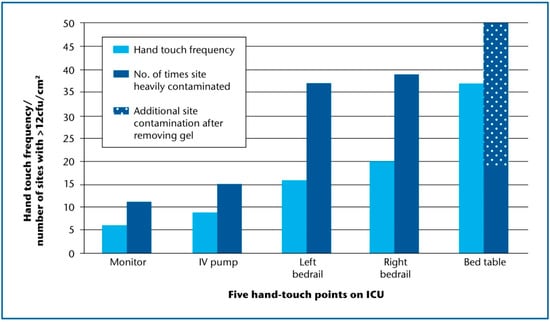Firstly, frequently touched near-patient sites would benefit from targeted cleaning in the ICU, although the definitions of “cleaning” and frequency are not yet established; furthermore, there is contention over choice of cleaning fluids, i.e., whether we should use disinfectant or detergent or both []. There is increasing awareness that routine removal of microbial soil using the “one wipe; one site; one direction” principle is sufficient for infection prevention, rather than an attempt to kill all surface flora with disinfectants.