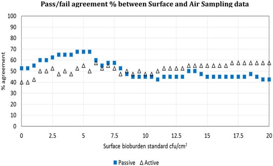The pass/failure rates from both air sampling methods were compared against the surface bioburden pass/fail rate on a site-by-site basis for each study day. There were just 19/40 (47.5%) pairs that agreed a pass or fail status between active air sampling data and surface bioburden, although settle plate data showed a closer relationship with surface counts (26/40: 65%) using the 2.5 cfu/cm2 benchmark []. Given that this benchmark has yet to become universally established, it was questioned whether pass/fail proportions for active air and settle plate counts would demonstrate a similar relationship with surface data if another surface standard was used. Consequently, all surface bioburden data was assigned pass or fail against a range of different standards from 1–20 cfu/cm2. The closest pass/fail agreement between any air parameter and specific surface standard occurred at 5 cfu/cm2 for settle plate data, with 70% agreement (Figure 3) [].