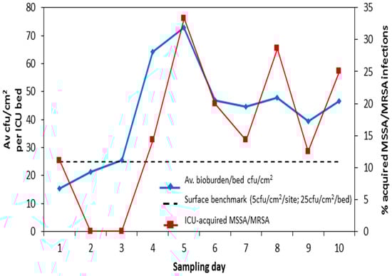 We identified eleven patients with ICU-acquired staphylococcal infections occurring within the 72 h period encompassing each study day. Taking % bed occupancy into account, the number of these infections was plotted against total surface cfus per bed (all five bed sites) for Beds 2–10 for each individual study day. We ignored data from the isolation room because all patients with ICU-acquired infections were identified in the main ICU. Bed occupancy rate-adjusted ICU-acquired staphylococcal infection was associated with average surface count for patients in the main body of the ICU (p = 0.012) (Figure 4) [].
