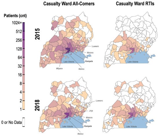 During 1–31 July 2015, a total of 2962 patients (Female: 40%; average age of all patients: 35.4 years) presented to the casualty ward at MNRH (Table 3). Similarly, in July 2018, there were a total of 1306 patients (Female: 28%; average age of all patients: 30.1 years). In both cohorts, three-quarters of RTI patients (2015: 73.2%, 2018: 73.8%) reported a home address within 50 km of Kampala.