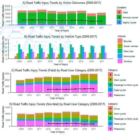RTI trends from 2009 to 2017. Averages are overlaid as points. For C and D, “Passenger on Motorcycle” category was not available from 2009 to 2011, so averages were not calculated. (A): By victim condition: killed, seriously injuried, or slightly injuried (B): By vehicle type: bicycles, goods vehicle, motor car, motorcycle, or omnibus (C): Fatal injuries by road user: driver, motor cyclist, motorcycle passenger, pedal cyclist, or pedestrian (D): Non-fatal injuries by road user.